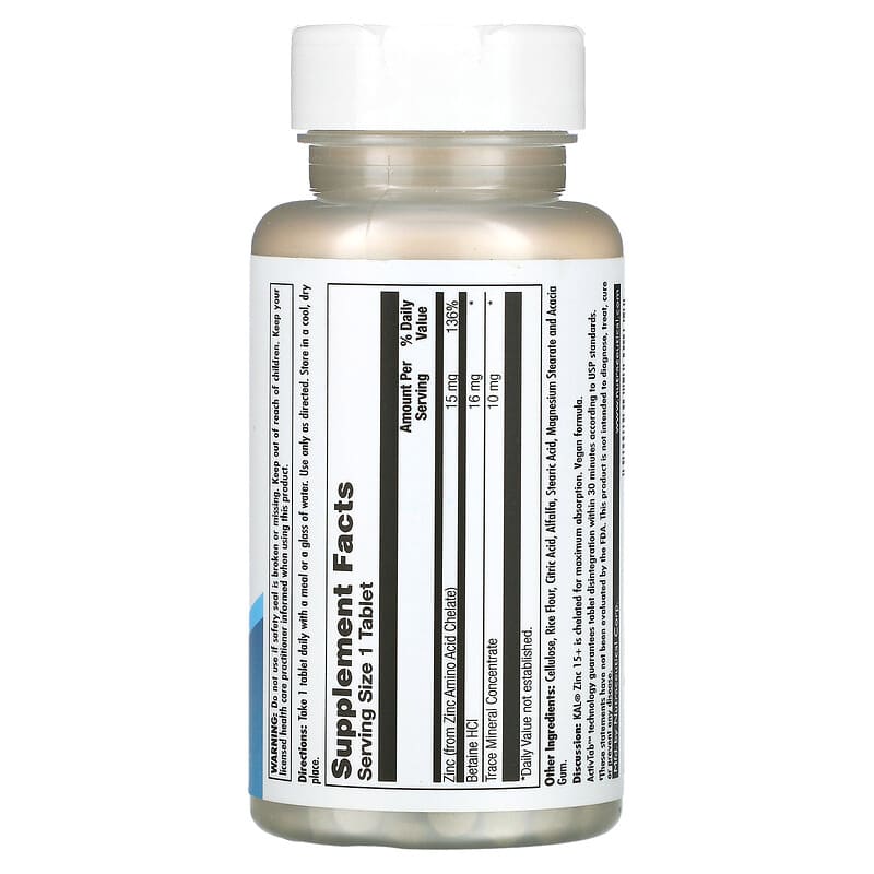 1 DailySince 1932Trust QualityImmune System Support Dietary Supplement VeganGluten FreeKAL® Zinc 15+ is chelated for maximum absorption. ActivTab™ technology guarantees tablet disintegration within 30 minutes according to USP standards.