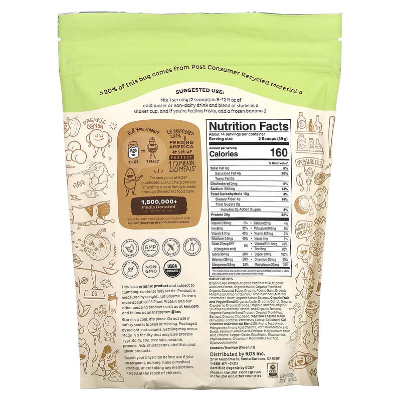 Organic pea protein, organic coconut milk, organic alkalized cocoa, organic inulin, organic flax seed, organic coconut sugar, organic acacia gum, organic mint flavor, organic quinoa, himalayan salt, natural chocolate flavor, organic stevia extract, organic fruit and veggie blend (organic apple, organic carrot, organic cranberry, organic orange, organic broccoli, organic shiitake mushroom extract, and organic tomato), organic pumpkin seed protein, organic monk fruit extract, organic chia seed, digestive enzyme blend (amylases, lactase, proteases, lipase, cellulase), kos vitamins and minerals blend (dl – alpha tocopherol, manganese amino acid chelate, potassium iodide, zinc oxide, selenium amino acid chelate, molybdenum amino acid chelate, copper oxide, riboflavin, niacinamide, phylloquinone, chromium picolinate, folic acid, cyanocobalamin). Contains tree nuts (coconuts).