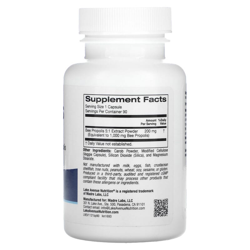 Lake Avenue Nutrition Bee PropolisFeaturing 5:1 Bee Propolis Extract (Equivalent to 1, 000 mg of Bee Propolis)Anti-Inflammatory Support*Formulated without Gluten, GMOs, or SoyProduced in a GMP Facility