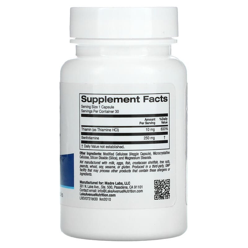 Thực phẩm chức năng Lake Avenue Nutrition Benfotiamine with Thiamine 250 mg 30 Veggie Capsules chính hãng nhập khẩu từ Mỹ, Mã vạch 898220020102, Quy cách: 0.04 kg, 30 viên