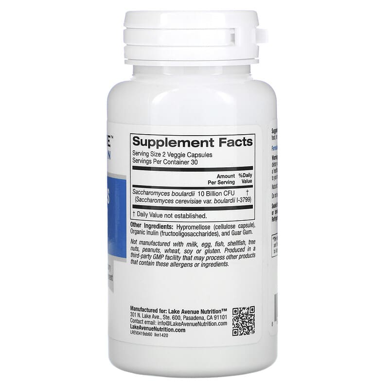 Lake Avenue Nutrition Saccharomyces BoulardiiProbiotic Yeast, 10 Billion CFUSupports Intestinal Flora*Suitable for Vegetarians and VegansFormulated without Gluten, GMOs, Soy, or DairyProduced in a GMP Facility