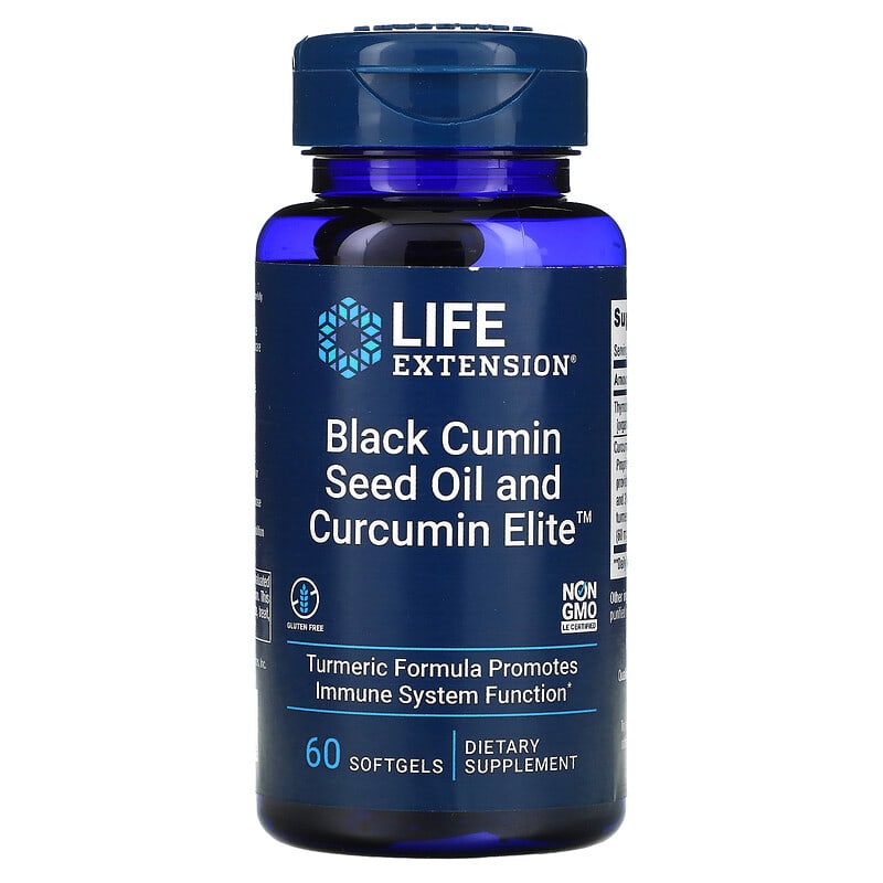 Gluten Free Non-GMO LE CertifiedTurmeric Formula Promotes Immune System Function Dietary Supplement Black cumin seed oil helps maintain your body’s healthy immune and inflammatory responses. Curcumin, an extract of turmeric, contains compounds that encourage immune health and help inhibit inflammation to support heart, brain, and whole-body health. This formula has them both. Both turmeric and black cumin seed extracts support immune health. We’ve combined both in this convenient formula. Black Cumin Seed Oil and Curcumin Elite™ BenefitsHelps maintain the balance between your body’s natural, healthy inflammatory and immune responses Helps inhibit inflammatory factors to promote immune system function as well as whole-body health Curcumin Elite™ offers over 45x more bioavailable free curcuminoids and provides 270 times better absorption of total curcuminoids than standard curcuminWhat is black cumin seed oil? Black cumin seed oil promotes a healthy immune and inflammatory response. Why did we add curcumin?Curcumin is an extract derived from the spice turmeric. It promotes a healthy inflammatory response, as well as whole-body health. Beefing Up Black Cumin Seed Curcumin is an extract of turmeric root known to promote healthy inflammatory and immune responses. That makes it an excellent complement to black cumin seed oil, which has been shown to promote immune response and help inhibit inflammation to support whole-body health. Get your daily dose of both nutrients in this one convenient formula. Product Details Managing a healthy immune and inflammatory response are both critical for maintaining your health. Finding a way to balance these two aspects of your physiology is essential. Black cumin seed oil, with its wide range of active compounds, has been shown to help maintain the healthy balance between your body’s healthy inflammatory response and immune health. Combining black cumin with turmeric Curcumin is an extract of turmeric. It is a potent nutrient packed with compounds called curcuminoids known to help inhibit inflammation to support healthy heart and joint health, as well as encourage a healthy immune response. Our new, proprietary Curcumin Elite™ turmeric extract has 45 times more free curcuminoids and over 270 times more total curcuminoids than standard turmeric extracts. That translates to more health benefits for your entire body. Supports a healthy inflammatory responseBlack cumin seed oil has been shown to support the body’s healthy inflammation response by moderating the effect of critical cell-signaling chemicals and hormone-like messengers. Maintaining healthy cell signaling as you age is key to both a healthy inflammatory response as well as immune system function. The free curcuminoids in turmeric extract promote the body’s healthy inflammation response as well. They also help inhibit inflammatory factors like arachidonic acid, cyclooxygenase, lipoxygenase, and cytokine compounds to support heart health, brain health and whole-body health. Boosts the immune systemBlack cumin seed oil also supports the body’s natural defenses by encouraging optimal function of a healthy immune system. It does this by helping to maintain the vital defensive activities of macrophages and helper T-cells that work together to bolster your immune system. Curcumin further promotes immune system health and supports a healthy inflammatory response. Two essential functions in one supplementBlack Cumin Seed Oil and Curcumin Elite™ from Life Extension® helps you maintain a healthy immune system and promotes a healthy inflammation response with a single, convenient supplement formula. Plus, we’ve recently upgraded our formula to include ultra-bioavailable Curcumin Elite™, which has much better absorption than standard curcumin.