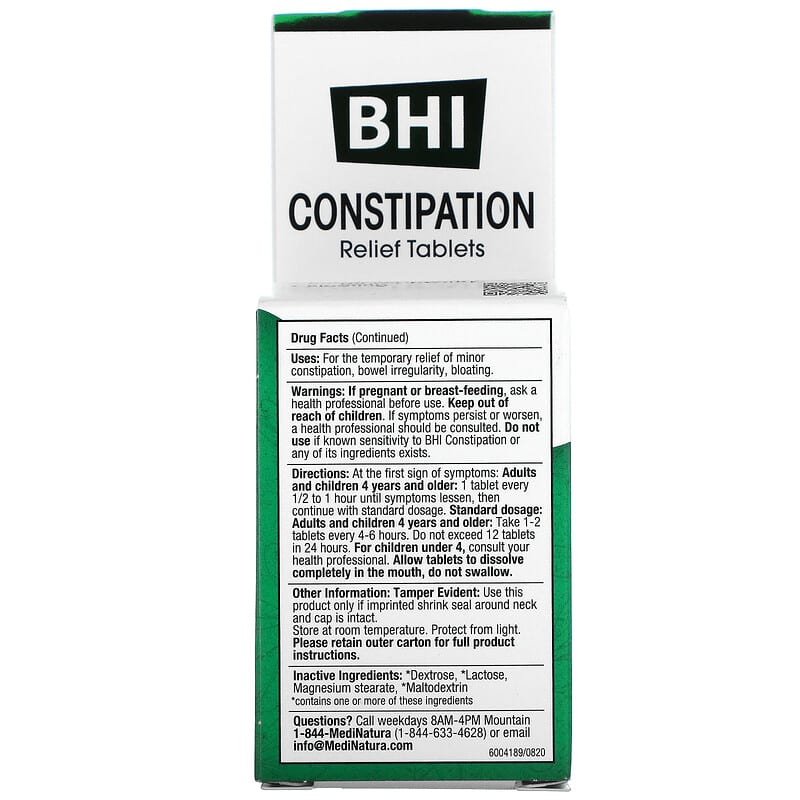 Thực phẩm chức năng MediNatura BHI Constipation Relief 100 Tablets chính hãng nhập khẩu từ Mỹ, Mã vạch 787647100163, Quy cách: 0.05 kg, 100 viên