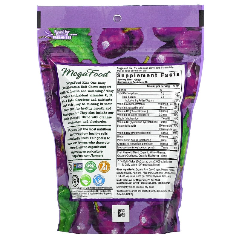 With Other Natural Flavors Non GMO Project Verified 30 Servings Multivitamin & Mineral Dietary Supplement Certified B Corporation Glyphosate Residue Free Tested 125+ Pesticide & Herbicides Tested Gluten Free Vegetarian Dairy Free – Soy Free MegaFood Kids One Daily Multivitamin Soft Chews support optimal health and well-being. They provide antioxidant vitamins C, E, plus Beta Carotene and nutrients that kids may be missing in their daily diet for healthy growth and development. They also include our Fruit Phenolic Blend with oranges, cranberries, and blueberries. We believe that the most nutritious food comes from healthy soils and valued farmers. Our goal is to work with farmers who share our commitment to organic and regenerative agriculture.