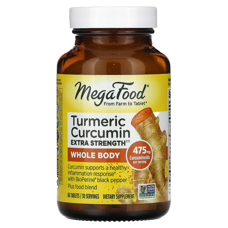 Whole Body475 mg of Curcuminoids Per ServingSupports a Healthy Inflammation ResponseWith Bioperine® & Vitamin CNon GMO Project Verified Dietary Supplement Certified VeganNSF Certified Gluten-FreeDairy FreeSoy FreeTested 125+ Pesticides & HerbicidesKosherGlyphosate Residue FreeCertified B CorporationMegaFood Turmeric Curcumin Extra Strength†† for Whole Body is made with a proprietary blend of turmeric root and turmeric extract to deliver a guaranteed minimum of 475 mg curcuminoids to support a healthy inflammation response. † We include BioPerine®, a patented black pepper extract that helps support the absorption of curcumin, together with cherries and berries for added nourishment. This MegaFood product is made with real food and added nutrients. This vitamin is paired with a whole food in our unique process. Meet Our Farmers – We believe that the most nutritious food comes from healthy soils and valued farmers. Our goal is to work with farmers who share our commitment to organic and regenerative agriculture. This product is made with food-paired vitamin C. ††This product delivers 475 mg curcuminoids, 2x the amount, compared to our Turmeric Curcumin Minis. *Made without milk, eggs, peanuts, tree nuts, soy, wheat, fish, shellfish and sesame.