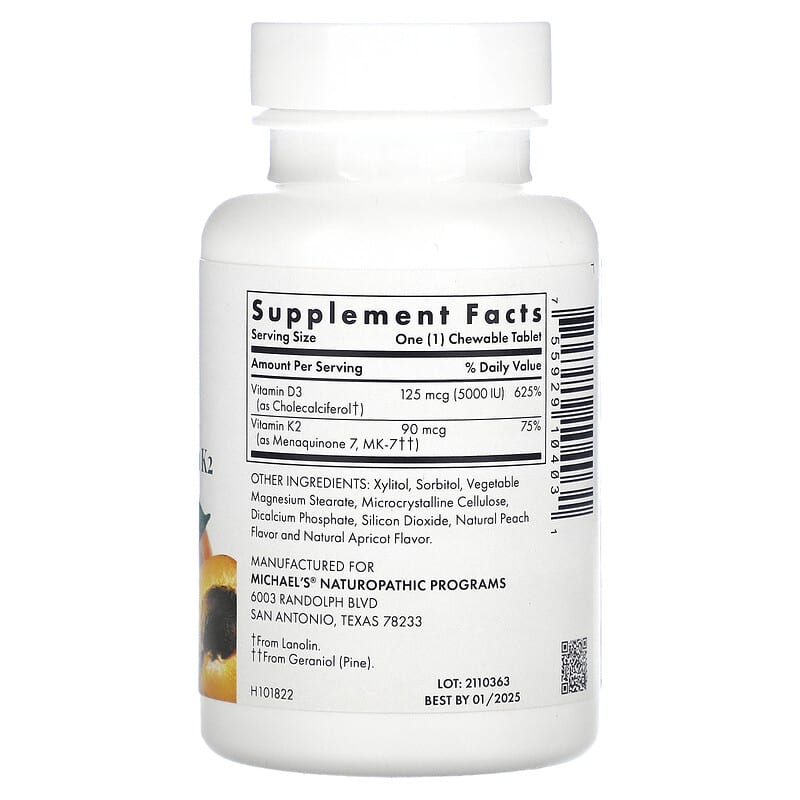 Thực phẩm chức năng Michael's Naturopathic Vitamin D3 with Vitamin K2 Apricot 5.000 IU 90 Vegetarian Chewable Tablets chính hãng nhập khẩu từ Mỹ, Mã vạch 755929104031, Quy cách: 0.05 kg, 90 viên