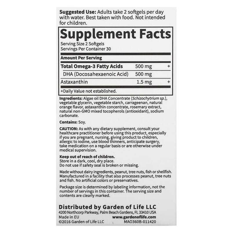 Algae oil DHA concentrate (shizochytrium sp. ), vegetable glycerin, vegetable starch, carrageenan, natural orange flavor, astaxanthin concentrate, silica rosemary extract, natural non – GMO mixed tocopherols (antioxidant), sodium carbonate. Contains soy. Made without dairy ingredients, peanut, tree nuts, fish or shellfish. Manufactured in a facility that also processes peanut, tree nuts and fish. No artificial colors or preservatives.