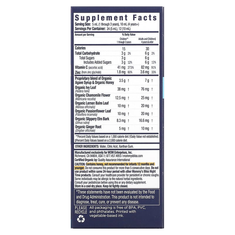 With Bedtime Bliss BlendUSDA OrganicLiquid Dietary Supplement Certified Organic by: Quality Assurance InternationalAll Packaging is Free of BPA, PVC and PhthalatesWomen Owned and LedNon GMO Certified by NSF®With organic honey and ivy leaf to help your child when coughing to clear mucus. Organic kids cough syrup & mucus night time is an herbal supplement carefully crafted for kids to soothe dry throat and helps when coughing to clear mucus. With Bedtime Bliss BlendA dreamy blend of chamomile, lemon balm, and passionflower to calm and promote relaxation. for moms, by momsOur family-run company was founded by my mom, who raised three children while working as a nurse & certified midwife. Driven by compassion for other moms, she created Mommy’s Bliss to safely and naturally bring families back to wellness. As a new mom myself, I understand how important it is to choose products that I trust to work effectively, safely and make my little ones happy!Yasmin Kaderali, mom, daughter & CEO