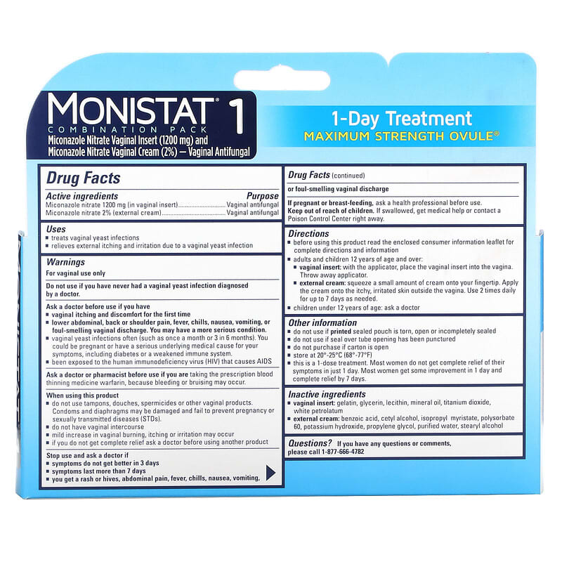 Stay in PlaceOvule® Insert plus External Cream for Itch ReliefMiconazole Nitrate Vaginal Insert (1200 mg) and Miconazole Nitrate Vaginal Cream (2%)Vaginal AntifungalCures Most Vaginal Yeast InfectionsRelieves Associated External Itching and IrritationMONISTAT® 1 Combination Pack contains a 1-dose OVULE® Insert that cures most vaginal yeast infections, plus an external cream that can be used for relief of itching and irritation on the skin outside the vagina (vulva) due to a yeast infection. Uses:Treats vaginal yeast infectionsRelieves external itching and irritation due to a vaginal yeast infection