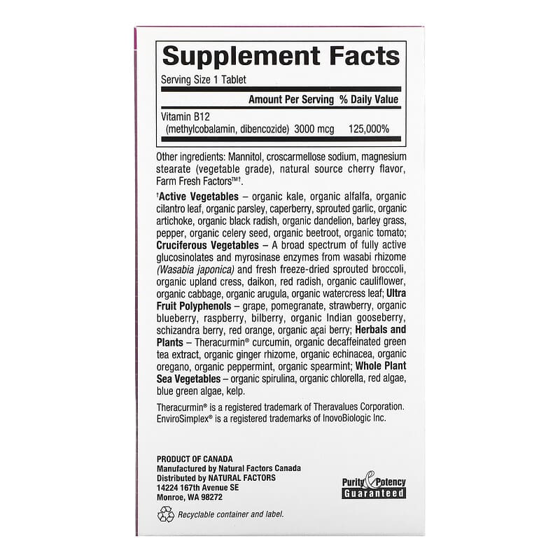 Mannitol, croscarmellose sodium, magnesium stearate (vegetable grade), natural source cherry flavor, farm fresh factors™†. †Active Vegetables – organic kale, organic alfalfa, organic cilantro leaf, organic parsley, caperberry, sprouted garlic, organic artichoke, organic black radish, organic dandelion, barley grass, pepper, organic celery seed, organic beetroot, organic tomato; Cruciferous Vegetables – a broad spectrum of fully active glucosinolates and myrosinase enzymes from wasabi rhizome (wasabia japonica) and fresh freeze – dried sprouted broccoli, organic upland cress, daikon, red radish, organic cauliflower, organic cabbage, organic arugula, organic watercress leaf; Ultra Fruit Polyphenols – grape, pomegranate, strawberry, organic blueberry, raspberry, bilberry, organic indian gooseberry, schizandra berry, red orange, organic acai berry; Herbals and Plants – Theracurmin® curcumin, organic decaffeinated green tea extract, organic ginger rhizome, organic echinacea, organic oregano, organic peppermint, organic spearmint; Whole Plant Sea Vegetables – organic spirulina, organic chlorella, red algae, blue green algae, kelp. Contains no artificial colors, preservatives, or sweeteners; no dairy, starch, sugar, wheat, gluten, yeast, soy, egg, fish, shellfish, animal products, salt, tree nuts, or GMOs. Manufactured by Natural Factors to ensure safety and potency in accordance with Good Manufacturing Practices (GMP) of the FDA and Health Canada.