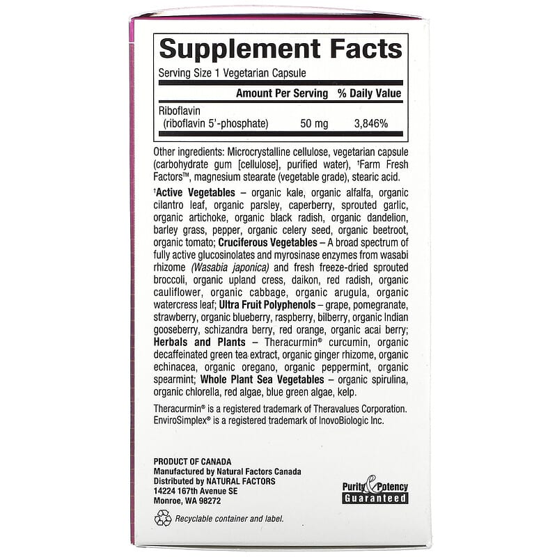 Microcrystalline cellulose, vegetarian capsule (carbohydrate gum [cellulose], purified water), †farm fresh factors™, magnesium stearate (vegetable grade), stearic acid. †Active Vegetables – organic kale, organic alfalfa, organic cilantro leaf, organic parsley, caperberry, sprouted garlic, organic artichoke, organic black radish, organic dandelion, barley grass, pepper, organic celery seed, organic beetroot, organic tomato; Cruciferous Vegetables – A broad spectrum of full active glucosinolates and myrosinase enzymes from wasabi rhizome (Wasabia japonica) and fresh freeze – dried sprouted broccoli, organic upland cress, daikon, red radish, organic cauliflower, organic cabbage, organic arugula, organic watercress leaf: Ultra Fruit Polyphenols – grape, pomegranate, strawberry, organic blueberry, raspberry, bilberry, organic indian gooseberry, schizandra berry, red orange, organic acai berry; Herbals and Plants – Theracurmin® curcumin, organic decaffeinated green tea extract, organic ginger rhizome, organic echinacea, organic oregano, organic peppermint, organic spearmint; Whole Plant Sea Vegetables – organic spirulina, organic chlorella, red algae, blue green algae, kelp. Contains no artificial colors, preservatives, or sweeteners; no dairy, starch, sugar, wheat, gluten, yeast, soy, egg, fish, shellfish, animal products, salt, tree nuts, or GMOs. Manufactured by Natural Factors to ensure safety and potency in accordance with Good Manufacturing Practices (GMP) of the FDA and Health Canada.