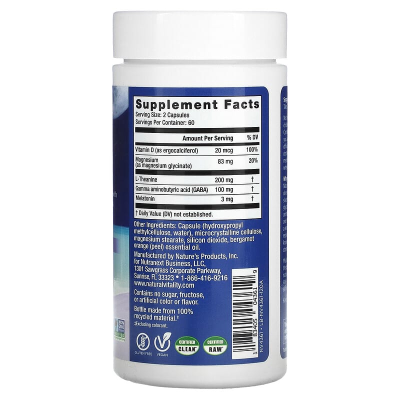 A Magnesium Glycinate Supplement With Melatonin – L-Theanine – GABAFor a Good Night’s Sleep Dietary Supplement Non GMO Project VerifiedGluten FreeVeganCertified C. L. E. A. N™Certified R. A. W. ™Why Natural Vitality Calm® Sleep Capsules?Natural Vitality Calm® Sleep Capsules were developed specifically for those times we need sleep support. They feature magnesium glycinate along with L-Theanine (a relaxing amino acid), GABA (a non-protein amino acid) and melatonin, which helps the body ease into a restful sleep. Magnesium glycinate helps replenish the body’s magnesium levels and. is known to be more absorbable and easier on the stomach than magnesium oxide. Multi-award-winning Natural Vitality CALM® is the best-selling magnesium supplement in the natural products market. (October 2020 Volume sales data for Natural Products market as defined by SPINS). Bottle made from 100% recycled material. ‡‡Excluding colorant.