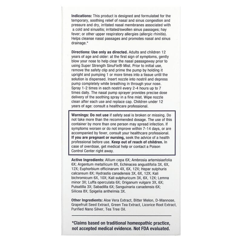 Use only as directed. Adults and children 12 years of age and older: at the first sign of symptoms, gently blow your nose to help clear the nasal passageway prior to using Super Strength SinuFix® Mist. Prior to initial use, remove the safety clip and prime the pump by holding it upright and pumping 1 or more times into a tissue until the solution is dispensed. Insert nozzle into nostril and depress pump completely while breathing in through your nose. Spray 1-2 times in each nostril every 2-4 hours up to 7 times daily. The nasal pump sprayer provides precise dose delivery of the soothing spray in a fine mist. Wipe nozzle clean after each use and replace cap. Children under 12 years of age: Consult a health care professional.