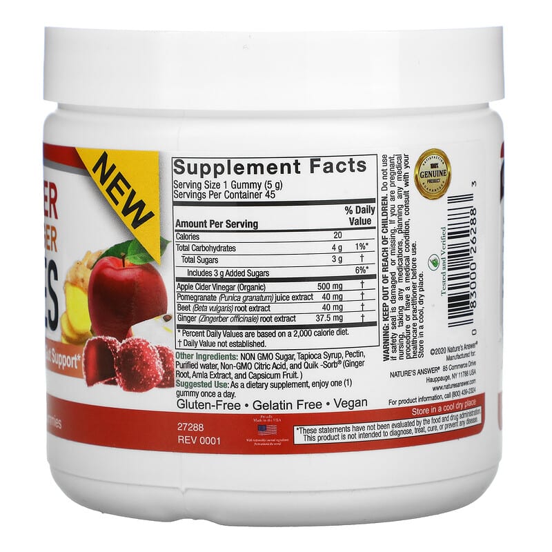 Since 1972Healthy Weight Management & Gut SupportMade with 500 mg Organic Apple Cider Vinegar Per Gummy Dietary Supplement Gluten-Free Gelatin Free Vegan Tested and Verified 100% Genuine Product Compare and See The Difference Nature’s Answer users only Organic Apple Cider Vinegar fresh from the farm where the organic apples are grown with clean water and bright sunshine, to bring you our delicious gummies. Our Apple Cider Vinegar with Ginger gummies contain “The Mother, ” which has naturally occurring prebiotics, probiotics, proteins, enzymes, friendly bacteria, good yeast, and amino acids. The Benefits: Helps maintain healthy weight With superfoods Pomegranate & Beetroot Naturally occurring prebiotics to support a healthy gut Supports a healthy immune systemHelps maintain normal glucose levels 2 gummies = 1 shot of Apple Cider Vinegar