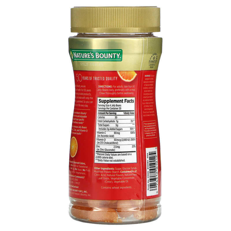 Supports a Healthy Immune SystemVegetarian Dietary Supplement Sodium FreeSuitable for VegetariansGuaranteed Quality – Laboratory Tested50 Years of Trusted QualityAt Nature’s Bounty, we are committed to your health. For 50 years we have been making trusted products, backed by science, and made with only the purest ingredients… guaranteed. So you can get the most out of life every day. Introducing new Nature’s Bounty® Jelly Beans, the fun and enjoyable way to support your specific health and wellness needs!These delicious Immune Jelly Beans feature Vitamin C, Zinc, and Vitamin D for daily immune health.