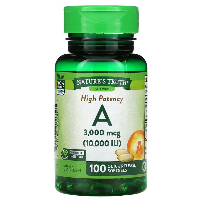 Sản phẩm Nature’s Truth High Potency Vitamin A 3.000 mcg (10.000 IU) 100 Quick Release Softgels không phải là thuốc và không có tác dung thay thế thuốc chữa bệnh. Bạn nên hỏi ý kiến của Bác sĩ hoặc Chuyên gia dinh dưỡng khi sử dụng.