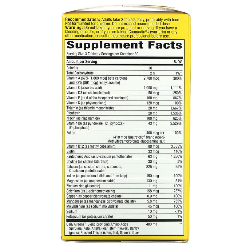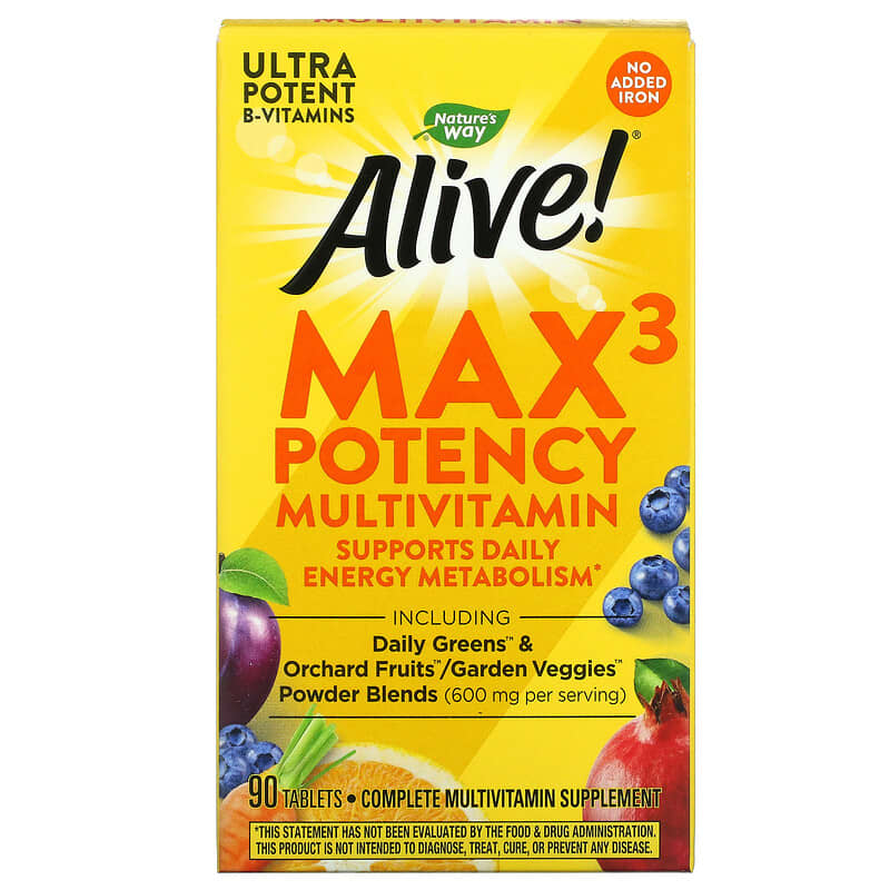 Ultra Potent B-Vitamins Supports Daily Energy MetabolismIncluding Daily Greens™ & Orchard Fruits™/Garden Veggies™ Powder Blends (600 mg Per Serving)Complete Multivitamin SupplementMAX Potency 3x DailyMultivitamin tablets with food-based blends, such as:Orchard Fruits™ / Garden Veggies™ Powder Blend Daily Greens™ Blend Providing Amino Acids Cardio BlendDigestive Enzyme BlendOmega 3/6/9 Fatty Acid Seed BlendCitrus Bioflavonoid Complex Mushroom Defense BlendWhole Body Nutrition with High Potency B-Vitamins including the active form of B-12 and Folate Eye Health: Beta Carotene (Vitamin A), Vitamin C, E, Lutein, Zinc Bone Health: Calcium, Folate, Magnesium, Manganese, Vitamins D3, KHeart Health: B-Vitamins, Vitamin C,EImmune Health: Selenium, Zinc, Vitamins A, C, D3Energy Metabolism: B-Vitamins Skin Health: Vitamins A, C, E, Zinc Alive!® multivitamins were created to give you the energy support you need to do all that is important to you! Get the most from your multi, with potent vitamins & minerals and our food-based blends, and live every day feeling Alive!