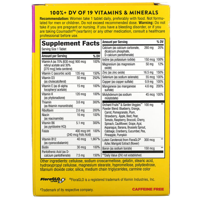 Once Daily High Potency B-Vitamins to Help Convert Food to Fuel Orchard Fruits™ & Garden Veggies™ Powder Blend (100 mg Per Serving) Multivitamin Supplement 100% DV of 19 Essential Vitamins & MineralsCaffeine Free FloraGlo® LuteinAlive!®multivitamins were created to give you the energy support you need to do all that is important to you! Get the most from your multi, with potent vitamins & minerals and our food-based blends, and live every day feeling Alive! Balanced For Women 50+ to Support Multiple Body Systems: Heart Bones Cellular Energy Immunity Eyes
