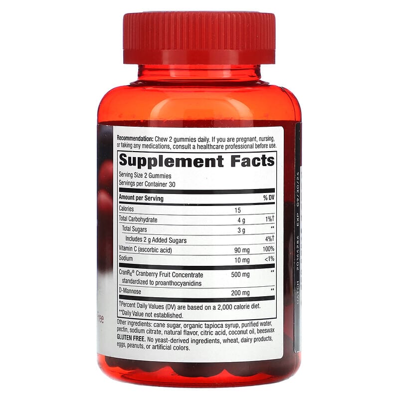 Since 1969D-MannoseVitamin CGluten-Free Dietary Supplement Pectin-Based GummiesSweetened with Tapioca & Cane Sugar100% Whole Cranberry (standardized to PACS [proanthocyanidins]), Vitamin C and D-Mannose to support urinary health.
