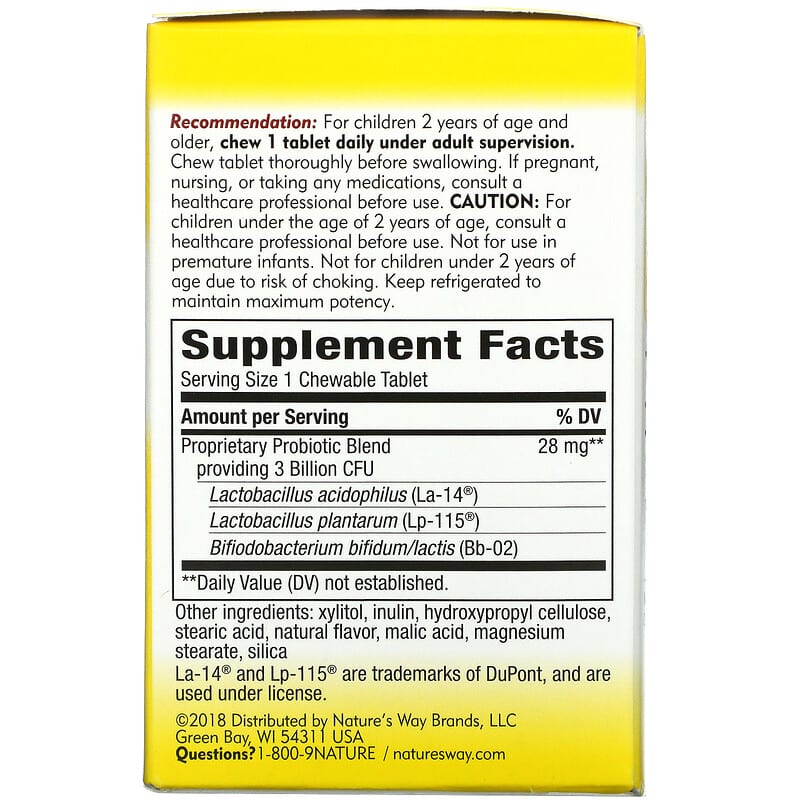 Once DailyFor Healthy Digestive FloraSince 1969TRUE IDENTITY™ – Lactobacilli & BifidobacteriaTRUE POTENCY™ – 3 Billion CFU Dietary Supplement TRUE GUARANTEE Probiotic™Certified Authentic TRU-ID™CSP Technologies™Exclusively Backed by TRUE GUARANTEE™TRUE POTENCY™ ensures 3 billion CFUs per chewable for the entire shelf life. TRUE IDENTITY™ ensures only the strains listed on the label are found in the product. Formulated with 3 probiotic strains to support health digestive floraDelicious cherry flavorNew bottle technology extends shelf life and helps ensure quality and potencyInnovative New Bottle Technology Improves Shelf Life!New dual-layer bottle technology helps maintain potency through shelf life. The innovative inner layer removes moisture while the outer wall helps prevent moisture from reaching the probiotics. Other probiotic bottles don’t absorb moisture, which could potentially compromise quality and potency.