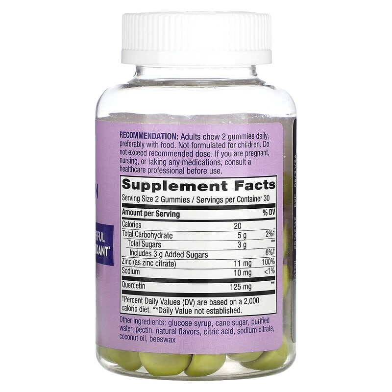 Immune Defense + Powerful Antioxidant Dietary Supplement Quality Global SourcingVegetarianGluten FreeDual Action Immune & Antioxidant SupportDual action support featuring a burst of quercetin plus 100% Daily Value of zinc per 2-gummy serving. Quercetin provides antioxidant support and helps move zinc into cells where it’s needed. * Zinc supports healthy immune function. These delicious lemon-flavored gummies will support your immune health every day. Supports the body’s immune defense systemPowerful antioxidant support