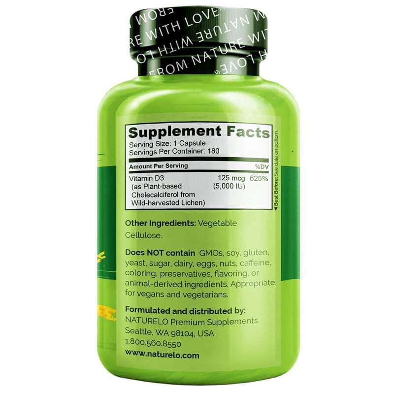 NATURELO Vitamin D3 Plant Based from Lichen 125 mcg (5.000 IU) 180 Easy Swallow Capsules chính hãng