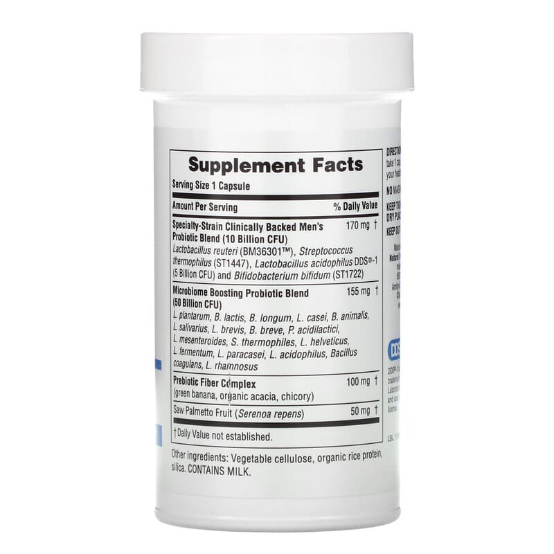 | Specialty-Strain Clinically Backed Men’s Probiotic Blend (10 Billion CFU) Lactobacillus reuteri (BM36301™), Streptococcus thermophilus (ST1447), Lactobacillus acidophilus DDS®-1 (5 Billion CFU) and Bifidobacterium bifidum (ST1722) |