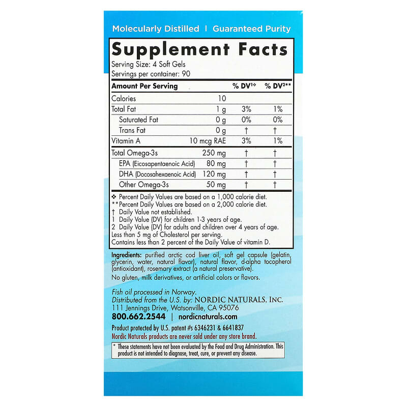 Purified arctic cod liver oil, soft gel capsule (gelatin, glycerin, water, natural flavor), natural flavor, d – alpha tocopherol (antioxidant), rosemary extract (a natural preservative). No gluten, milk derivatives, or artificial colors or flavors.