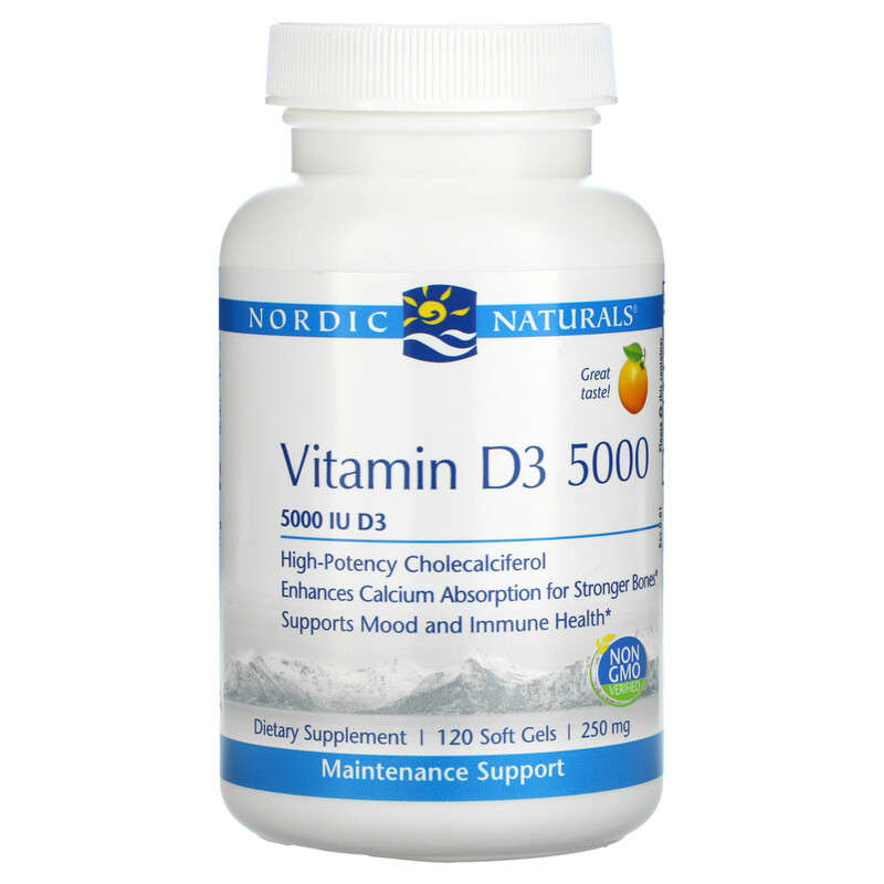 Great Taste!High-Potency CholecalciferolEnhances Calcium Absorption for Stronger BonesSupports Mood and Immune HealthNon GMO Verified Dietary Supplement 250 mgMaintenance SupportSurpasses the Daily Value for Vitamin DVitamin D has long been known for its important role in regulating the body’s levels of calcium and phosphorus as well as increasing mineralization in the bones. Nordic Naturals Vitamin D3 5000 is cholecalciferol, the natural, most easily absorbed and utilized form of Vitamin D. Each serving provides 5000 IU (125 mcg) of vitamin D3 in extra virgin olive oil.