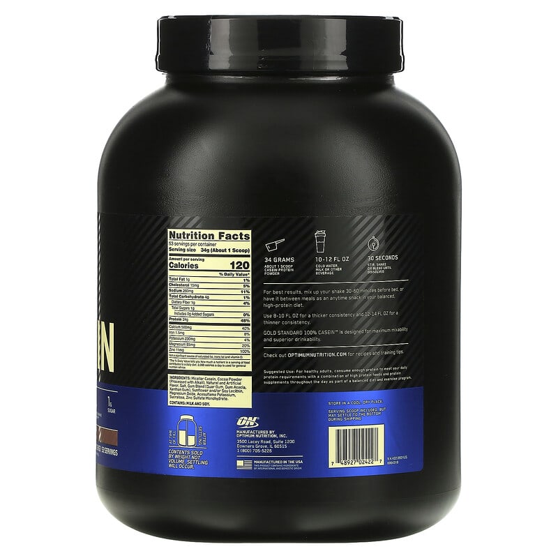 34 grams – Adult 1 scoop casein protein powder10-12 fl oz – Cold water, milk or other beverage30 seconds – Stir, shake or blend until dissolvedFor best results, mix up your shake 30-60 minutes before bed, or have it between meals as an anytime snack in your balanced, high-protein diet.Use 8-10 fl oz for a thicker consistency and 12-14 fl oz for a thinner consistency.Gold Standard 100% Casein™ is designed for maximum mixability and superior drinkability.For healthy adults, consume enough protein to meet your daily protein requirements with a combination of high protein foods and protein supplements throughout the day as part of a balanced diet and exercise program.