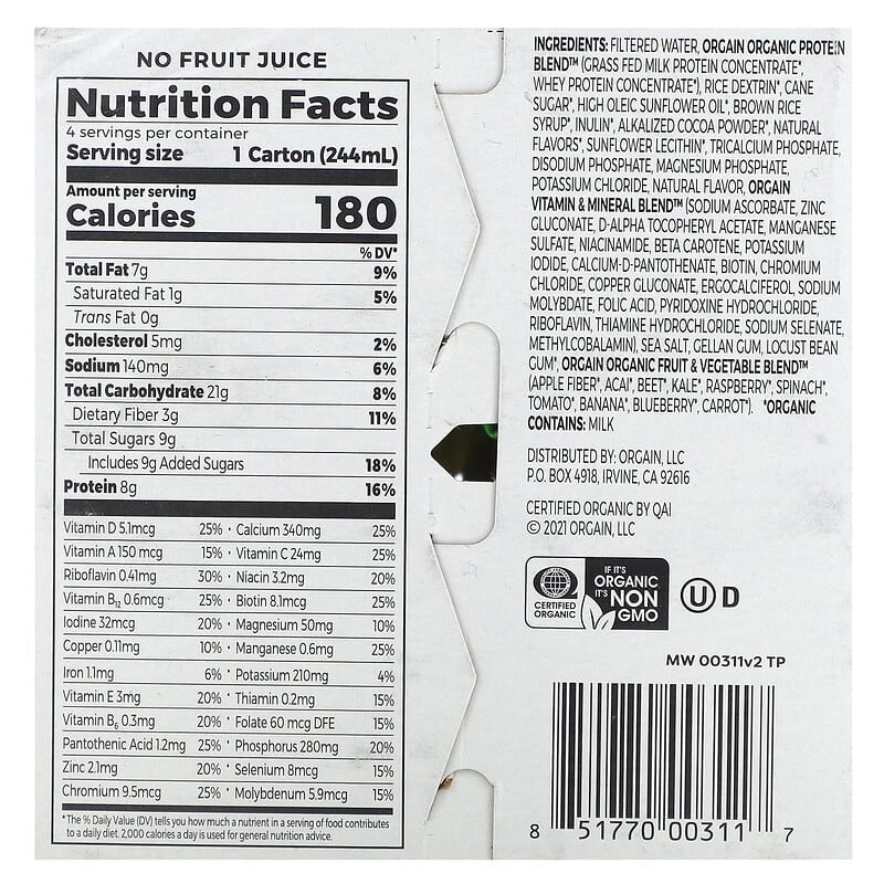 Thành phần có trong Orgain Kids Protein Organic Nutritional Shake Chocolate 4 Pack 8.25 fl oz (244 ml) Each