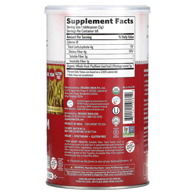 Keto Paleo VeganGluten Free Triple Sifted to be Gentle Dietary Supplement USDA OrganicNon GMO Project VerifiedHeart Healthy Certified B CorporationHealthy Conscious Living Certified Organic by Control UnionKosher Halal VegetarianWe Wish You a Life of Good Health and HappinessAt The Heart Of Organic India is our commitment to be a living embodiment of love and consciousness in action. All our products promote health and happiness and are made with loving care. Ethical, Authentic, Reliable, Trustworthy, Holistic Socially, Environmentally, Economically ResponsibleOrganic India Psyllium is an excellent source of both soluble and insoluble natural dietary fiber. Helps maintain healthy elimination and regularityPromotes appetite controlSupports the entire gastrointestinal systemNever treated with toxic pesticides or chemicalsResearch shows that the soluble fiber from PSYLLIUM, along with a healthy diet low in saturated fat and high in fruits, vegetables, and grain products that contain fiber, may reduce the risk of heart disease****For Heart Health: Soluble fiber from foods such as psyllium as a part of a diet low in saturated fat and cholesterol and high in fruits, vegetables, and grain products that contain fiber, may reduce the risk of heart disease. A serving of psyllium