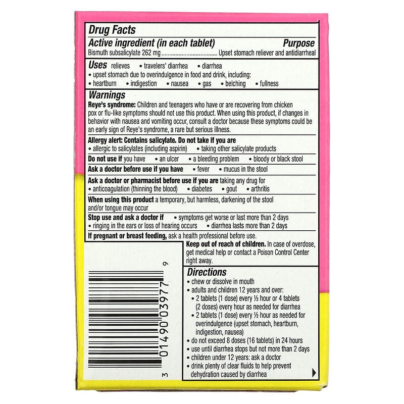 Active Ingredient (in each tablet)PurposeBismuth subsalicylate 262 mgUpset stomach reliever and antidiarrhealInactive Ingredients: Calcium carbonate, d&c red no. 27 aluminum lake, flavor, magnesium stearate, mannitol, povidone, saccharin sodium, talc.