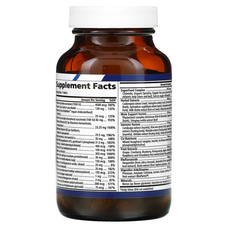 Non GMOVeganGluten FreeOrganic Ingredients100% Purity & PotencyOn-Daily Whole Food Based Multivitamin Dietary Supplement Supports General Health, Energy Production, Immune Function, Stress ResponseWith over 11, 400 mg of whole food value, One ‘n’ Only™ Men combines vitamins, minerals, organic superfoods, superior herbs, cell protecting antioxidants and uniquely masculine factors into an amazing one-daily multivitamin and mineral complex to support:Energy LevelsImmune & Stress ResponseVirility & Prostate HealthGeneral MetabolismCellular Health