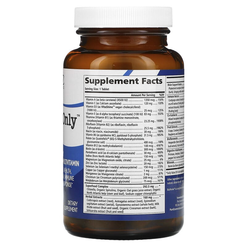 Non GMOVeganGluten FreeOrganic Ingredients100% Purity & Potency Dietary Supplement On-Daily Whole Food Based MultivitaminSupports General Health, Energy Production, Immune Function, Stress ResponseWith over 13, 900 mg of whole food value, One ‘n’ Only™ Men combines vitamins, minerals, organic SuperFoods, Superior Herbs, cell protecting antioxidants and uniquely masculine factors into an amazing one-daily multivitamin and mineral complex to support:Energy LevelsImmune & Stress ResponseVirility & Prostate HealthGeneral MetabolismCellular Health