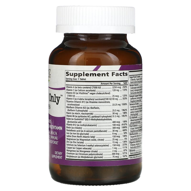 Non GMOVeganGluten FreeOrganic Ingredients 100% Purity & Potency Guarantee30 Servings Dietary Supplement Once-Daily Whole Food Based MultivitaminSupports General Health, Increased Energy, Immune Function, Stress ResponseWith over 14, 500 mg of whole food value, One ‘n’ Only™ Women combines vitamins, minerals. Organic Superfoods Superior Herbs, cell protecting antioxidants and uniquely feminine factors into an amazing one-daily multivitamin and mineral complex to support:Energy Levels Immune & Stress ResponseBone, Breast & Digestive Health Hormone BalanceGeneral Metabolism Cellular Health