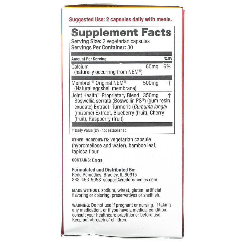 NEM® – Natural Eggshell MembraneFast 4-10 Days ResultsTurmeric & Boswellin® Dietary Supplement Gluten FreeNon-GMO§Lab Tested NEM® supports the health of the joint structure. Turmeric and Boswellia support joint comfort. Blueberries, Cherries and Raspberries have antioxidant properties important to the body during the normal aging process. Calcium is naturally occurring in NEM®. Every natural health solution from Redd Remedies is produced with 4-Point Quality ControlWe VerifyEvery raw material vendorEvery raw material usedEvery step pf the manufacturing and packaging processesEvery product specification for every batch including testing by industry-leading, independent laboratories§We do not use ingredients that were produced using biotechnology.