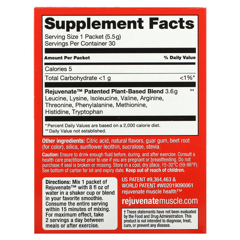 1. 5 x More Effective Than Whey ProteinOnly 5 CaloriesHelps Prevent Muscle LossIncrease Strength & EnergyClinically Proven Dietary Supplement Sugar, Gluten & Dairy FreeZero Fat & Keto FriendlyPatented Plant-Based FormulaRejuvenate™ Your Life!Most Americans strive to get enough protein in their diet, but not all proteins are created equal. Without quality and bio-available proteins that the body needs, muscle loss can occur. Rejuvenate Muscle Health™ is built upon the research of 25 clinical trials, with a patented plant-based blend providing the building blocks of protein for optimal muscle support. These nutrients are vital in maintaining strength, mobility and independence and are available in convenient, on-the-go options. Rejuvenate Muscle Health™ is the guilt-free way to help maintain and restore lean muscle, support muscle tone and promote vitality. Optimized ratio of pure protein components shown to be superior to wheyPatented formula works as an activator to metabolize protein betterClinically proven to maintain strength & help prevent muscle lossDelicious & convenient servings