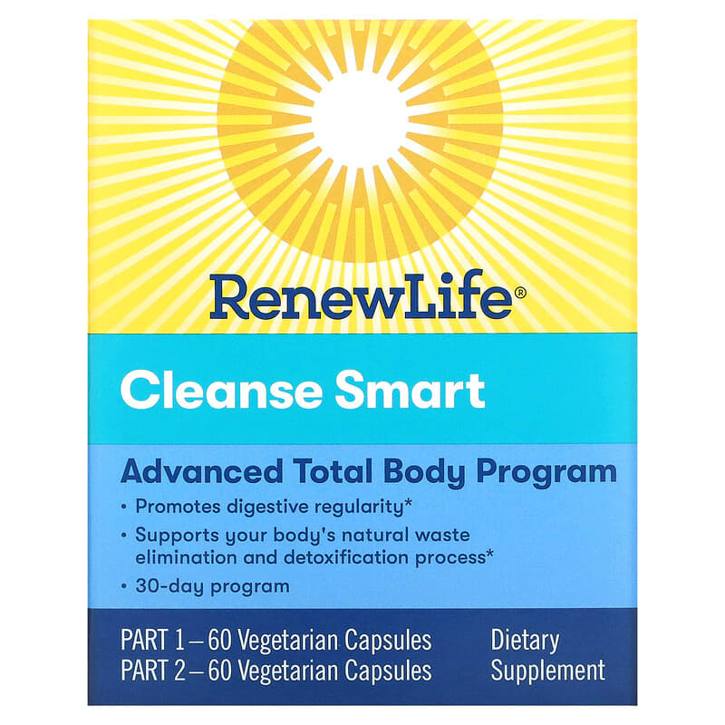 Advanced Total Body ProgramPromotes Digestive RegularitySupports Your Body’s Natural Waste Elimination and Detoxication Process30-Day Program Dietary Supplement Gluten FreeSoy FreePart 1 – 60 Vegetarian CapsulesPart 2 – 60 Vegetarian CapsulesListen to your gut… you’ll be glad you did. Did you know toxins are all around us?They live in the environment, in processed foods and even in your own digestive tract. While your body was built to handle toxins, today’s world can put a lot of stress on you. Renew Life® herbal cleanse and detox formulas promote regularity and work in harmony with your body’s natural detoxification process. Helping you feel lighter, brighter and more energized to take on the day. At Renew Life, We’re pioneers with double decades of experience and innovation on our side to help you cleanse and maintain your body’s natural harmony. 30-day, 2-part herbal cleansing programQuality, purity and potency guaranteed through expirationFree of gluten and soyQuality, purity and potency guaranteed through expiration.