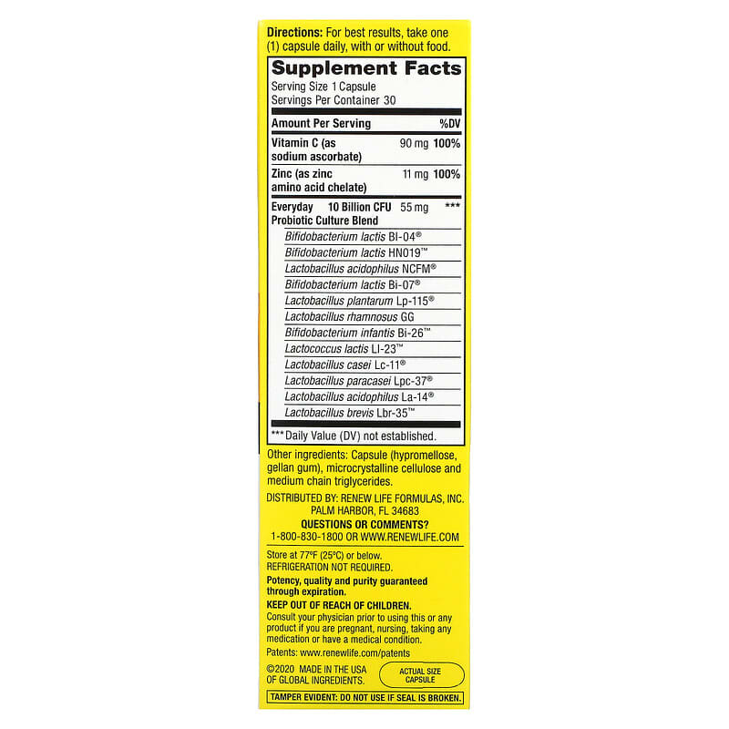 Thực phẩm chức năng Renew Life Everyday Immune Probiotics Zinc & Vitamin C 30 Vegetarian Capsules chính hãng nhập khẩu từ Mỹ, Mã vạch 631257122056, Quy cách: 0.04 kg, 30 viên