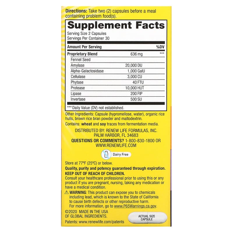 Helps Prevent Occasional Gas and BloatingHelps Digest Beans and Gas-Forming FoodsEnzyme SupplementDairy FreeListen to you gut… you’ll be glad you did. Did you know taking an enzyme before each meal can improve your digestion?Many processed and cooked foods often lack the digestive enzymes found in raw foods, so your body may have to work harder to break down and absorb nutriens. This can cause occasional gas, bloating and indigestion. Renew Life® plant-based enzymes work in harmony with your digestive system to reduce occasional digestive discomforts and unlock the nutrient goodness found in your food. Helping you feel lighter, brighter and more energized to take on the day. At Renew Life, we’re gut wellness pioneers with double decades of experience and innovation on our side to help keep your gut healthy and help you comfortably enjoy the foods you love. Quality, purity and potency guaranteed through expirationPlant-based enzymes for relief of occasional gasContains soothing fennel seed to help relax the digestive tractFree of dairy