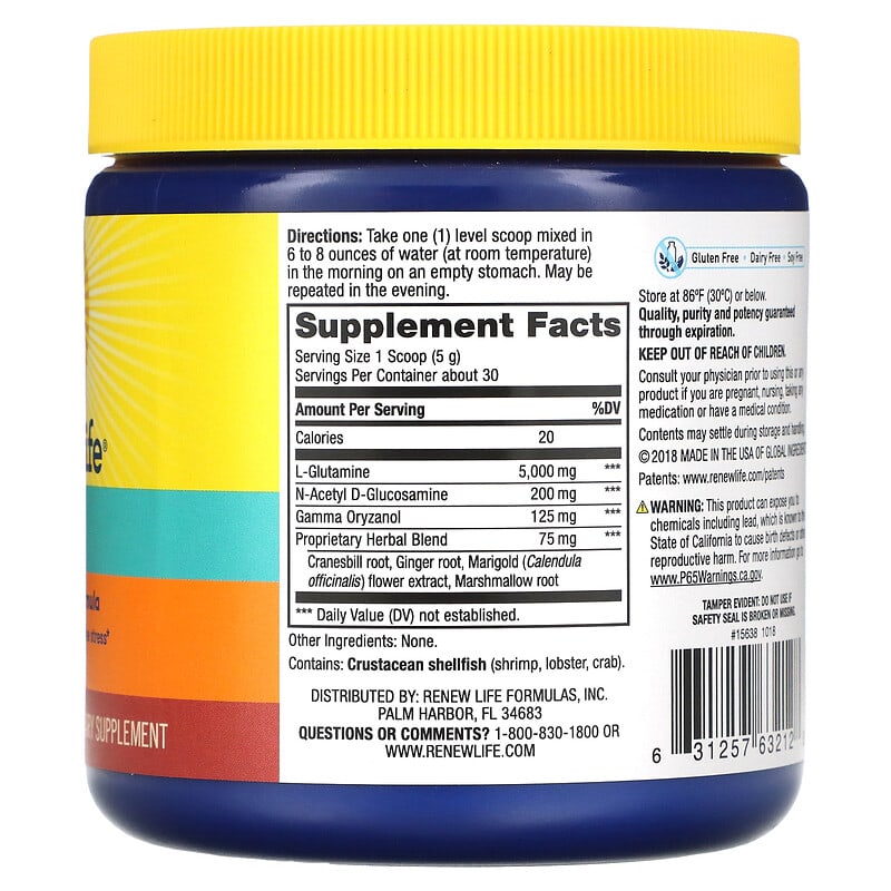 Dietary Supplement Gluten FreeDairy FreeSoy Free Targets Occasional Bowel and Digestive StressSupports Digestive Health At Renew Life, we’re gut wellness pioneers with double decades of experience and innovation on our side to help you maintain and restore your body’s natural harmony. Promotes a healthy intestinal lining and cellsMade with L-glutamine, N-acetyl D-glucosamine, gamma oryzanol and soothing herbsFree of gluten, dairy and soy
