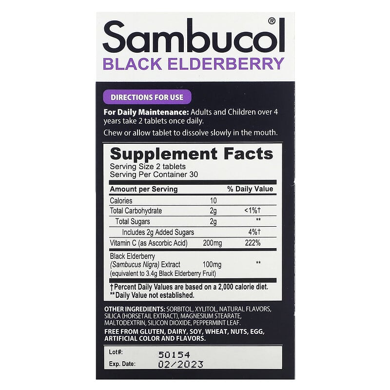 Providing the Equivalent of 3. 4 g of Elderberry Per ServingVegetarian Gluten Free Scientifically Tested Supports ImmunityHigh Antioxidant Levels Dietary Supplement Kosher CheckUse Daily for Maximum BenefitSupports the Immune SystemVirologist Developed Scientifically TestedGreat Tasting TabletNaturally Flavored with the Goodness of ElderberrySambucol®, the original Black Elderberry extract, provides strong immune system support to help you and your family stay healthy throughout the year. Sambucol® Black Elderberry extract conveniently arms you with some of the best protection nature has to offer. Developed by a world renowned virologist, Sambucol® is the unique black elderberry extract that has been used in scientific studies. By using a proprietary method of extraction, only SambucolⓇ can guarantee consistent, immune supporting