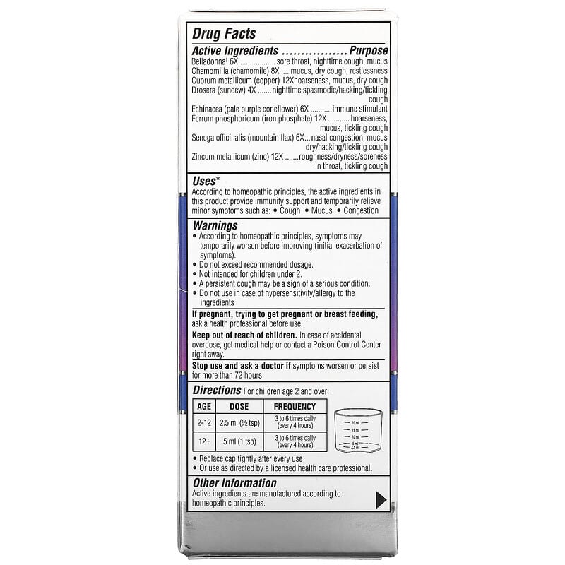 According to homeopathic principles, symptoms may temporarily worsen before improving (initial exacerbation of symptoms). Do not exceed recommended dosage. Not intended for children under 2. A persistent cough may be a sign of a serious condition. Do not use if case of hypersensitivity/allergy to the ingredients. If pregnant, trying to get pregnant or breast feeding, ask a health professional before use. Keep out of reach of children. In case of accidental overdose, get medical help or contact a Poison Control Center right away. Stop use and ask a doctor if symptoms worsen or persist for more than 72 hours. For your protection do not use if tamper evident seal around neck of bottle is missing or broken.