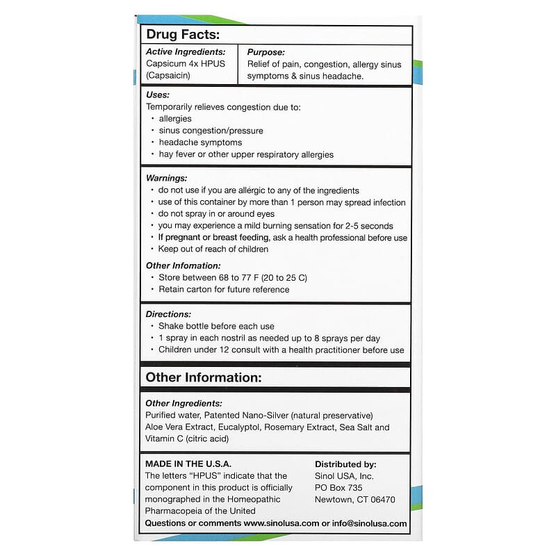 Fast Relief From Allergy & SinusRelieves Allergy & Sinus SymptomsClears Congestion in SecondsNon-Habit FormingDoctor RecommendedClinically Proven EffectivenessSinol-M™ is a Homeopathic Drug114 SpraysUses:Temporarily relieve congestion due to:AllergiesSinus congestion/pressureHeadache symptomsHay fever or other upper respiratory allergies