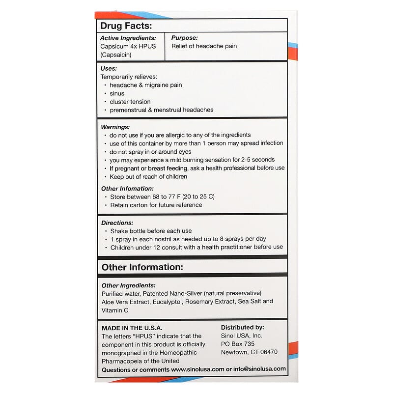 Drug FactsActive Ingredients:Purpose:Capsicum 4X HPUS (capsaicin)Relief of headache painInactive Ingredients: Purified water, patented nano – silver (natural preservative) aloe vera extract, eucalyptol, rosemary extract, sea salt and vitamin C. The letters “HPUS” indicate that the component in this product is officially monographed in the Homeopathic Pharmacopeia of the United.