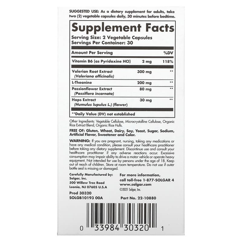 Melatonin-FreeGluten, Wheat & Dairy FreeSuitable for VegansNon-GMO Dietary Supplement A clinically-studied blend of sleep-supporting herbs, plus L-theanine for stress support. Too often, stressful days can lead to sleepless nights. That’s why there’s Solgar® Sleep & Stress Support. Contains calming L-theanine (an amino acid commonly found in green tea). Also contains a combination of three naturally-sourced herbs that work together to support sound sleep. Valerian is a plant that is traditionally used to promote relaxation and helps with occasional sleeplessness. Passionflower is a vine that has been used for centuries for its soothing properties. Hops are flowers that have a long history of use throughout Europe. Relax And Get A Sound Night’s Sleep With Solgar® Sleep & Stress Support®Improves sleep quality so you can wake feeling ready to take on the dayHelps relax and calm youHelps you fall asleep quickly and get a good night’s sleepPromotes rest throughout the nightFor occasional sleeplessness and stressMelatonin-free100% drug-freeNon-habit forming