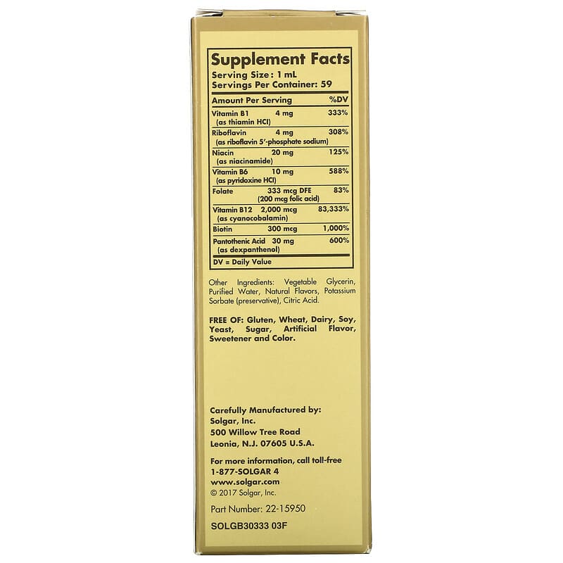 Since 1947With B-ComplexGluten, Wheat & Dairy FreeSuitable for VegansKosher Parve Dietary Supplement Solgar’s Sublingual Liquid B-12 2000 mcg with B-Complex is designed to provide an advantage over conventional B-Complexes by offering an easy-to-use liquid formula for anyone who has difficulty in swallowing tablets or capsules. Our liquid formula also does not need to be broken down in the digestive tract as compared to a standard pill. As we age, absorption of key nutrients such as Vitamin B-12 can decline, which is why it is important to take a formula that is also easy to digest. Solgar’s Sublingual Liquid B-12 2000 mcg with B-Complex is free of gluten, artificial flavors, colors and sweetener, so you receive a pure vitamin supplement that is also great tasting.