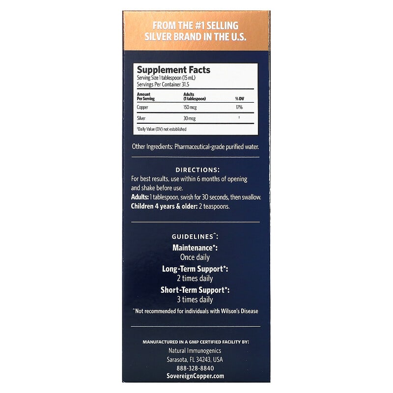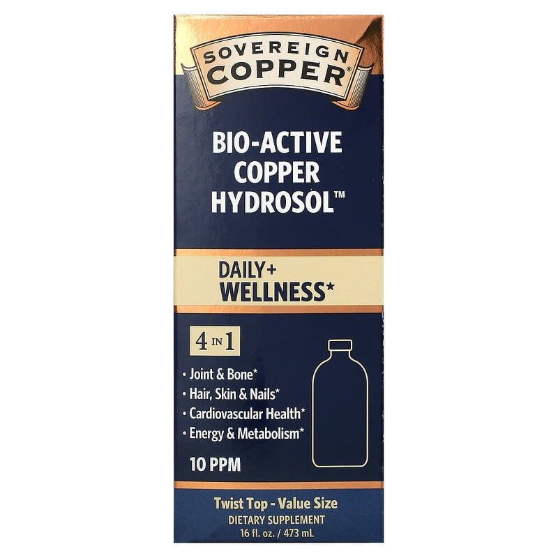 Daily + Wellness10 ppmTwist TopValue Size Dietary Supplement GMO FreeVeganGluten FreeAllergen FreeFrom the #1 Selling Silver Brand in the U. S. 4 in 1 Joint & BoneHair, Skin & Nails Cardiovascular Health Energy & MetabolismThe Ultimate Refinement of CopperSafe – Copper is an essential trace mineral the body uses every day. Our 10 ppm bio-active copper is so powerful, a little goes a long way. With a low parts per million (ppm) concentration within the Recommended Daily Intake (RDI), it’s safe for the whole family. Pure – Just 3 ingredients: 99. 999% pure copper, pharmaceutical-grade water and a hint of pure silver. Packaged in non-leaching, amber glass bottles (never plastic), to keep it as pure and powerful as the day it was created. Effective – Other copper products give you only one form of it. Sovereign Copper delivers two forms of copper (I and Il) that work together for superior absorption, cellular uptake and metabolism. How Does Sovereign Copper Support Wellness? Copper is a critical component of enzyme activity in the body. As a result, many functions depend on it to: Support strong and flexible arteries, cartilage and connective tissueBuild collagen for skin elasticity Absorb iron and aid in red blood cell production Produce cellular energy Act as an antioxidant to fight free radical damage Benefits of Sovereign Copper, From the Inside Out: Relieves achy joints & bones Promotes strong hair, skin & nails Supports healthy cardiovascular function Improves energy & metabolism Slows the aging process