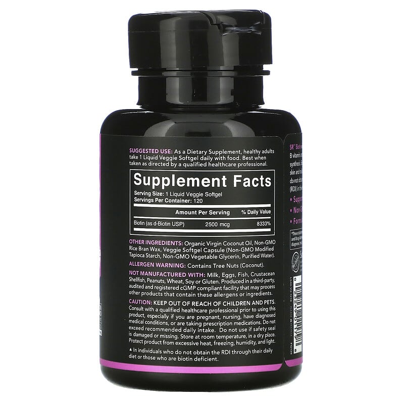 Hair, Skin NailsMade with Coconut Oil Dietary Supplement Certified VeganGluten FreeGood Manufacturing Practice – GMP Certified3rd Party Certified TestedNon GMO Project VerifiedSR™ Biotin with Virgin Coconut Oil is an essential B vitamin and a vital nutrient involved in Keratin synthesis. Biotin may help support healthy hair, skin and nails in individuals who are deficient or do not obtain the Recommended Daily Intake (RDI) in their diet. ^